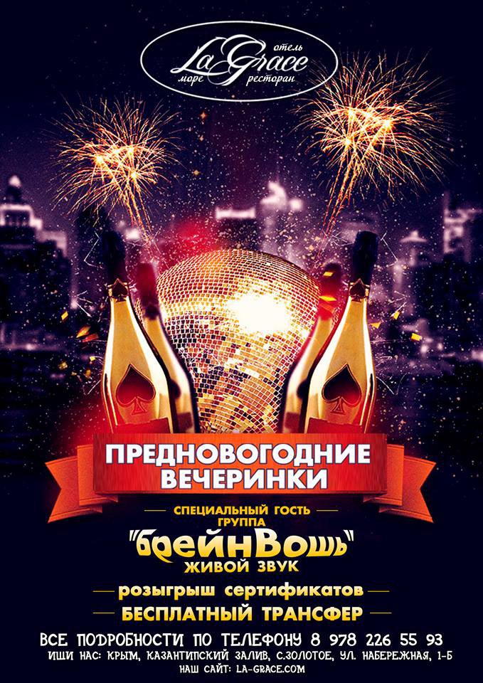 Дорогие друзья! LaGrace открывает сезон новогодних вечеринок. С 24 по 30 декабря каждый вечер ваши любимые каверы в исполнении группы «БрейнВошь», розыгрыш сертификатов и много других приятных сюрпризов. А также мы устроим яркий и незабываемый корпоративный праздник для вас и ваших сотрудников! Проведи незабываемый вечер под живую музыку, вдали от городской суеты.
