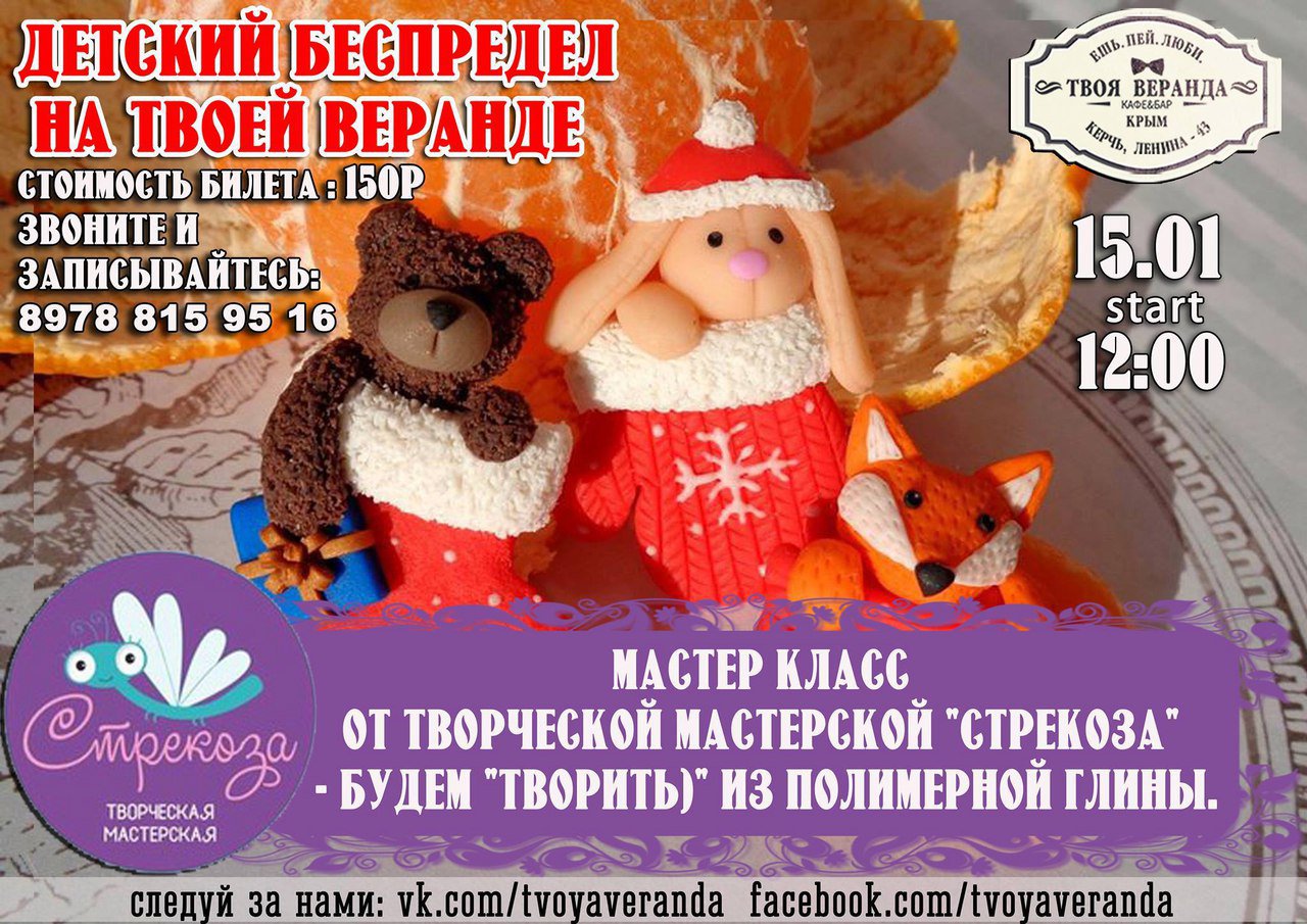 Новогодние каникулы - не только самое веселое время для детишек, но и интересное, и полезное! Твоя Веранда приглашает мам и их детишек 15 января в 12.00 посетить увлекательный мастер класс от творческой мастерской " Стрекоза. Наши юные гости с энтузиазмом и интересом научатся делать подделки из полимерной глины и смогут дать волю своей безграничной фантазии. Поверьте, попробовав пару раз слепить какую-либо вещь, ваш малыш уже не сможет оторваться от этого занятия. Стоимость билета 150 рублей. Записаться на мастер класс можно по телефону: 8 978 815 95 16