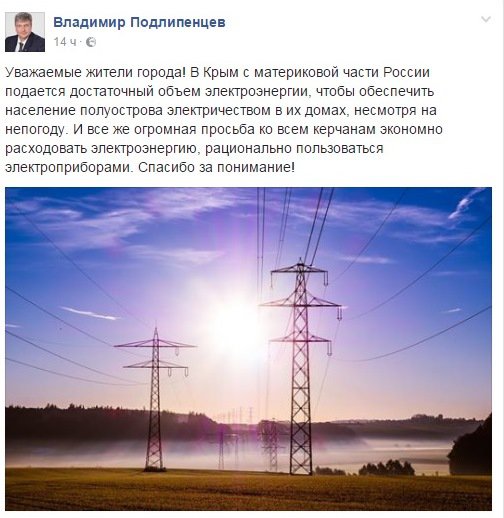 На странице в социальной сети глава администрации Керчи Владимир Подлипенцев обратился ко всем керчанам с просьбой экономно расходовать электроэнергию и рационально пользоваться электроприборами, - передает Керчь.ФМ.