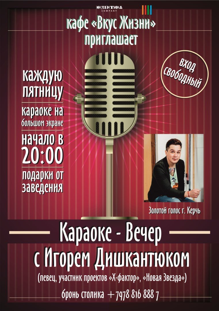 ("Х-фактор" и "Новая Зевзда") мы предлагаем провести Ваш вечер незабываемо и максимально ярко. Игорь Дишкантюк не только подарит Вам исполнение любимых хитов, но и зарядит творческой энергетикой. Никто не сможет отказать себе взять в руки микрофон! Скажем нет скованности и стеснению!
