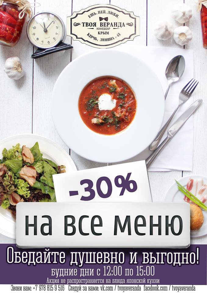 Хорошее настроение на весь день обеспечит сытный и полезный обед. А когда обед не только вкусный, но еще и выгодный - вдвойне приятно! Приглашаем всех на «Твою Веранду» пообедать с 12.00 до 15.00! Плати меньше -30% на все меню. Обедай со вкусом! С любовью, «Твоя Веранда»!)