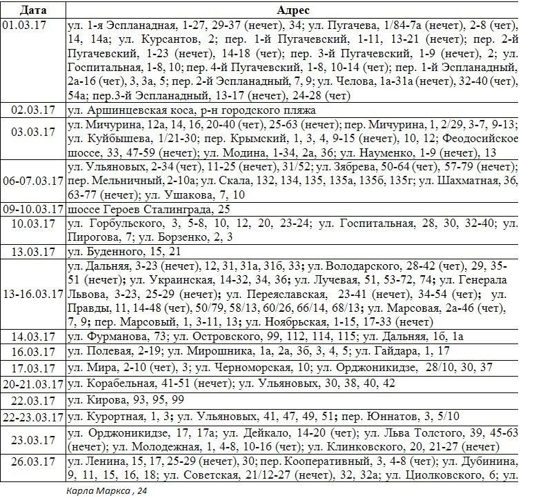 ГУП РК «Крымэнерго» сообщает о том, что в связи с плановым ремонтом электрооборудования в марте с 8 до 17 часов будут происходить отключения линий электропередачи согласно нижеприведенному графику, - передает Керчь.ФМ.