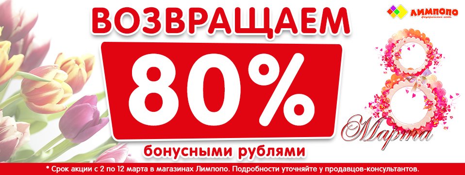 Скорее в «Лимпопо»! В честь 8 марта за любые покупки мы возвращаем 80% бонусными рублями. Дарить подарки вместе с «Лимпопо» - выгодно!