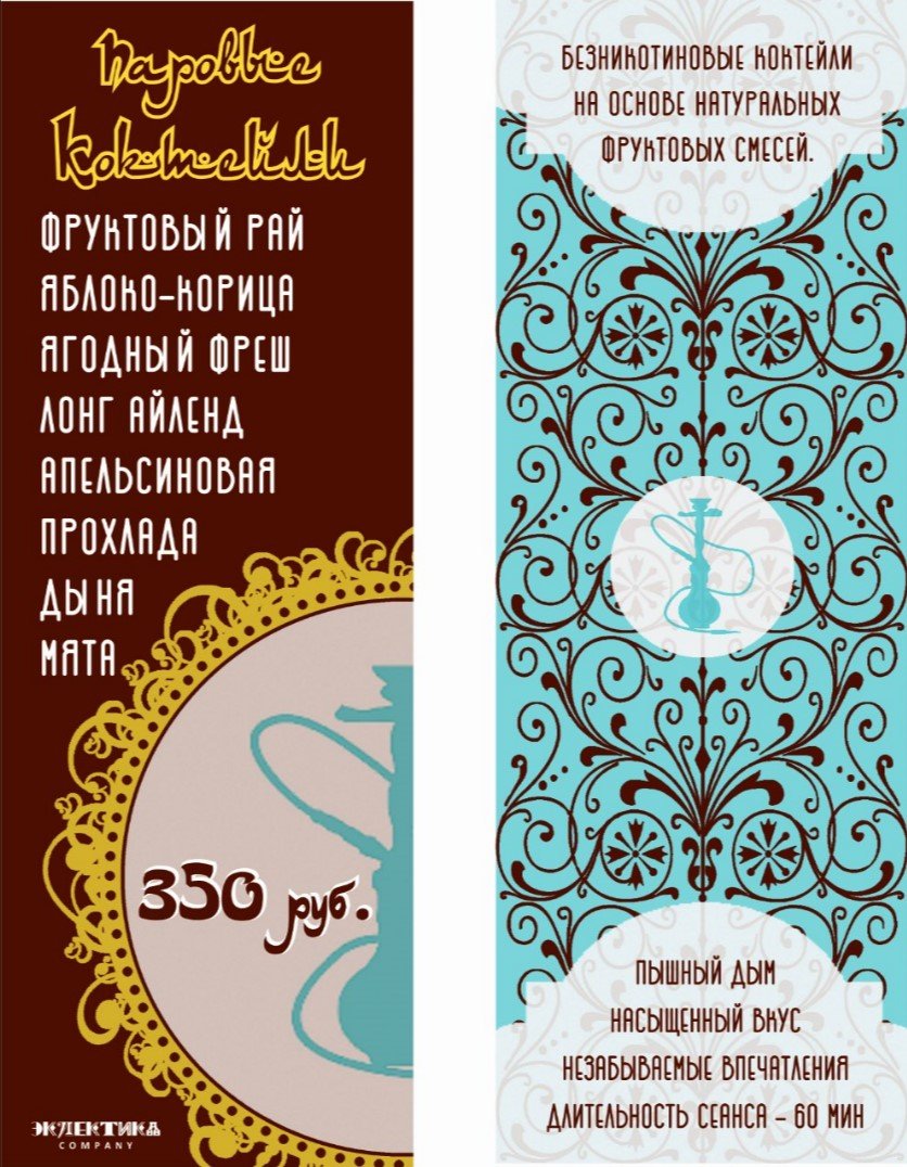 Каждый ПОНЕДЕЛЬНИК и ВТОРНИК при заказе парового коктейля Вы получаете 40% скидку на любой алкогольный коктейль из меню, а также неограниченный сеанс наслаждения безникотиновым паровым кальяном!