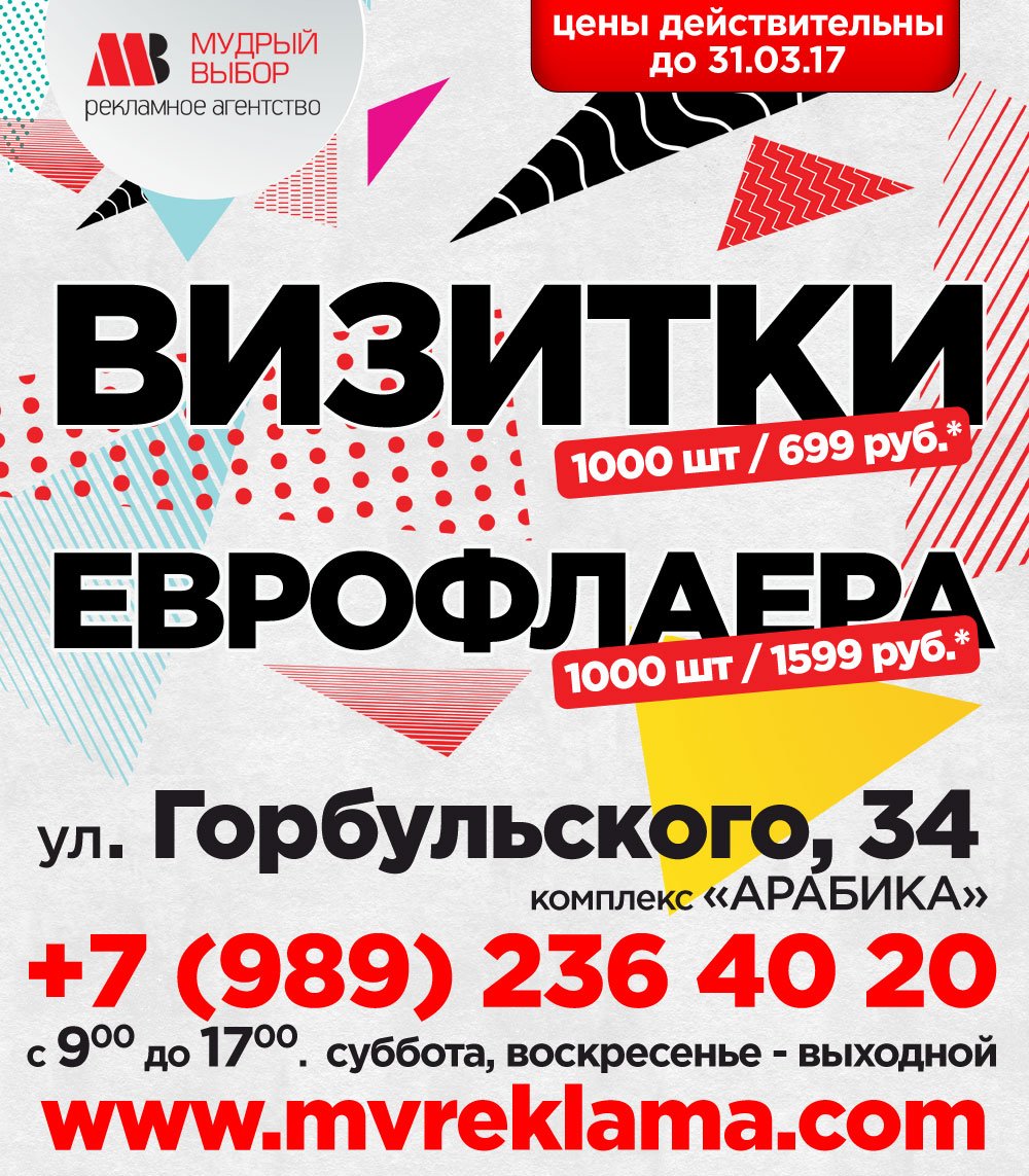 Рекламное агентство "Мудрый Выбор" предлагает своим клиентам высококачественные услуги печати визитных карточек на мелованной бумаге 300г./м2 с защитным УФ лаком, а также еврофлаера 100х210 мм., на мелованной бумаге 130г./м2 с двухсторонней полно цветной печатью по сниженным ценам до 31.03.2017г.