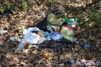 Сегодня, 20 апреля коммунальщики в парке косили и собирали траву, также собирали мусор. Однако, мусор в развалинах забыли собрать. Видимо в этом месте его не собирают долгое время. Кроме того, его туда еще и скидывают, так как там кроме пустых бутылок можно увидеть полные мусорные пакеты, ковры, шины и листву, собранную в кучи.