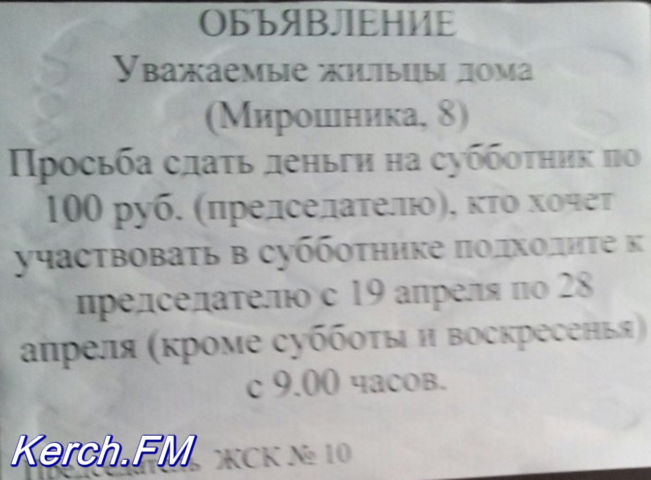 «Вот такие объявления встретились на подъездах дома... главное денежки, а когда субботник, наверное, председатель и сам не знает)) С19 по 28 апреля? С 9 часов недельный марафон? Ай да умнички, ай да молодцы!», - написали керчане.