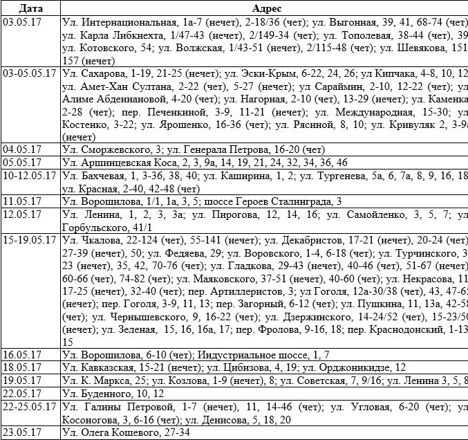 ГУП РК «Крымэнерго» сообщает о том, что в связи с плановым ремонтом электрооборудования в мае с 8 до 17 часов будут происходить отключения линий электропередачи согласно нижеприведенному графику, - передает Керчь.ФМ.