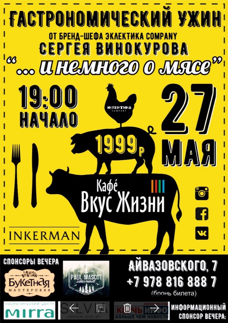 Винно-гастрономический ужин состоится 27 МАЯ, в банкетном зале кафе "Вкус Жизни" (Айвазовского, 7).