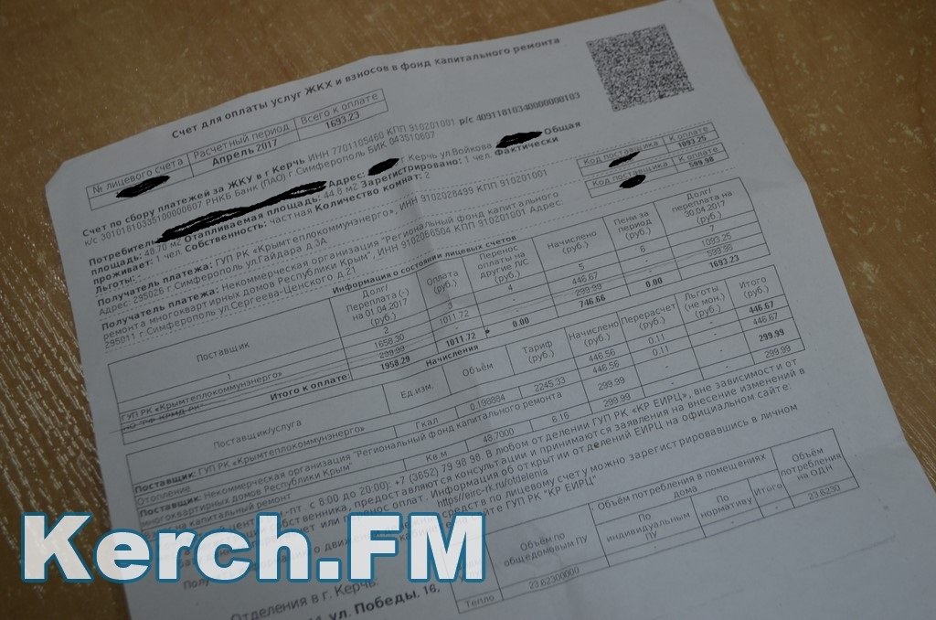 В редакцию Керчь.ФМ обратился постоянный читатель с жалобой на то, что на днях ему и его соседям пришла квитанция об оплате за капремонт, куда включили еще и долг за «Крымтеплокоммунэнерго». При этом, сумму за капремонт и отопление подбили в общую сумму. Это керчан и возмутило.