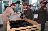 Первым по бутылкам игристое вино «Крымский мост» разлил завод шампанских вин «Новый Свет». Специалисты проводят одну из последних технологических операций - перекладку 7000 бутылок.