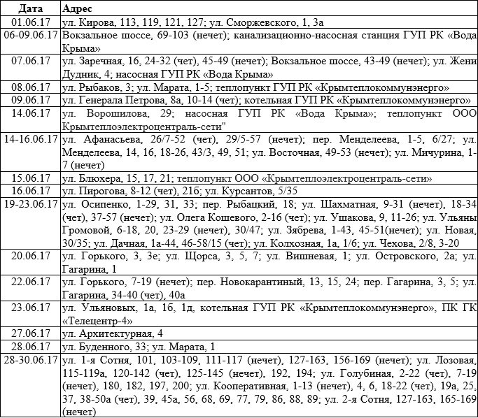 ГУП РК «Крымэнерго» сообщает о том, что в связи с плановым ремонтом электрооборудования в июне с 8 до 17 часов будут происходить отключения линий электропередачи согласно нижеприведенному графику, - передает Керчь.ФМ.