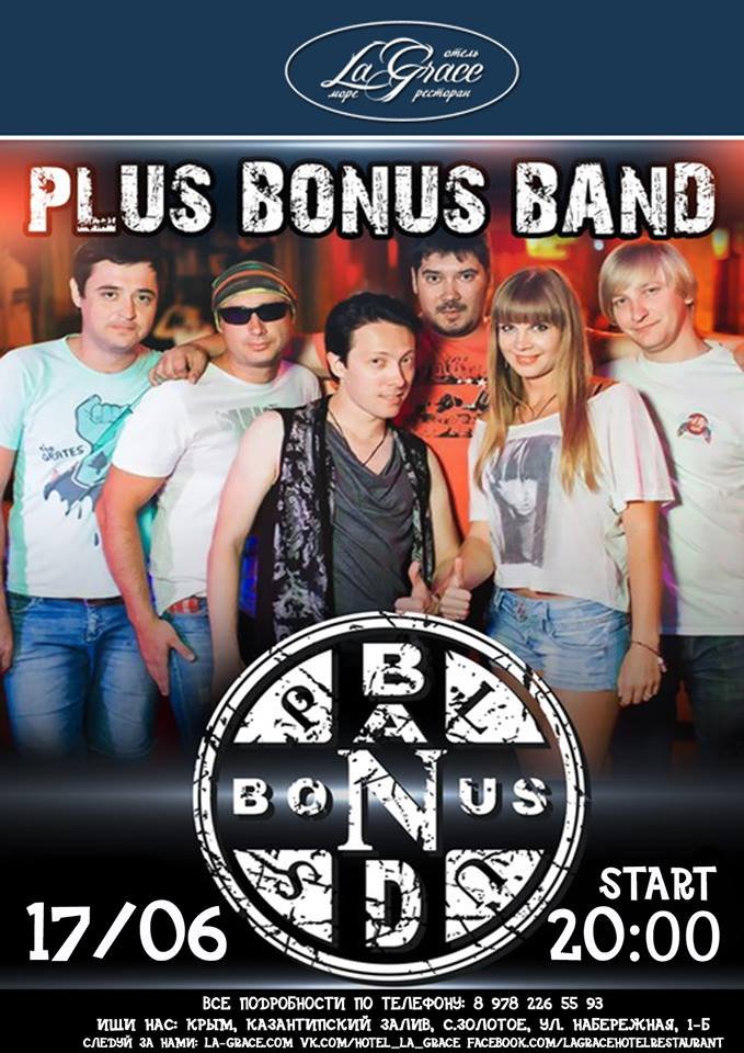 Друзья! Специально для Вас, 17 июня, в 20.00 в отеле LaGrace - концерт зажигательной кавер-группы PLUS BONUS BAND. Выступление этих ребят не оставит равнодушными любителей настоящих музыкальных хитов. Приходи-хорошее настроение обеспеченно!