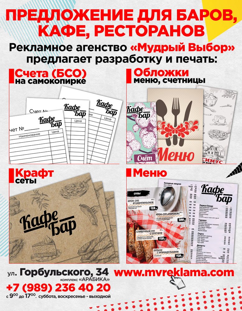 Рекламное агентство «Мудрый Выбор» имеет опыт более 8 лет по изготовлению и продвижению различной продукции для баров, кафе и ресторанов нашего города. В офисе компании представлены всевозможные варианты исполнения меню, коктейльных карт, сетов на стол, счетниц и т.д.