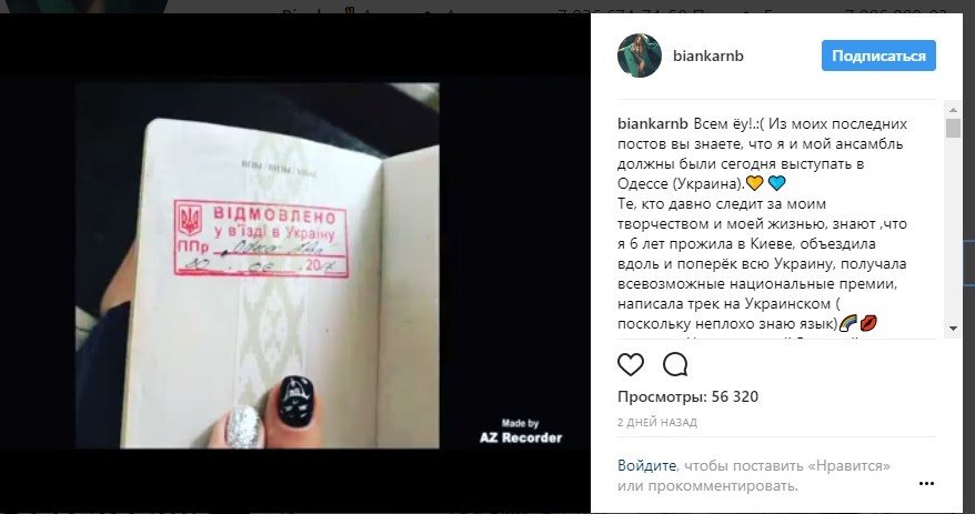 Известная певица Бьянка опубликовала в своем инстаграме фотографию с паспортом, где поставлена печать об отказе въезда в Украину. Под фотографией певица написала, что ее группа собиралась выступить в Одессе, но из-за выступления в Крыму ей запретили это делать.