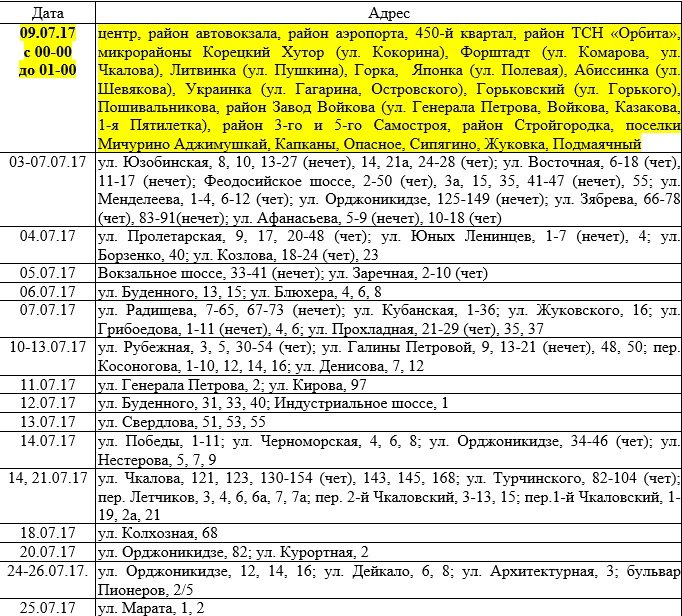 ГУП РК «Крымэнерго» сообщает о том, что в связи с плановым ремонтом электрооборудования в июле с 8 до 17 часов будут происходить отключения линий электропередачи согласно нижеприведенному графику. Предприятие изменило расписание и просит горожан с ним ознакомится, - передает Керчь.ФМ.