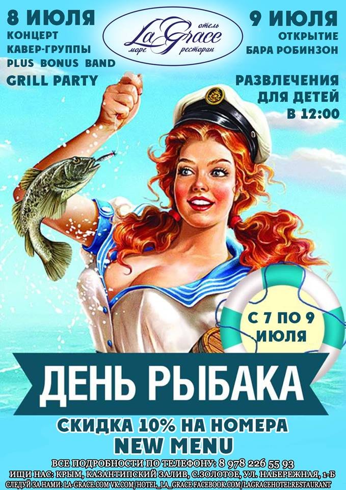 Друзья, хватит киснуть в городе)) Отпразднуйте главный праздник лета - День Рыбака в отеле LaGrace. Для Вас с 7 по 9 июля на номера будет действовать скидка 10%. 8 июля концерт всеми любимой драйвовой кавер-группы PLUS BONUS BAND. А 9 июля вы сможете насладится коктейлями прямо на пляже, ведь мы открываем летний бар Робинзон. Для нашим маленьких гостей в 12-00 развлекательная программа с аниматором. Проведи этот уикенд вместе с LaGrace.