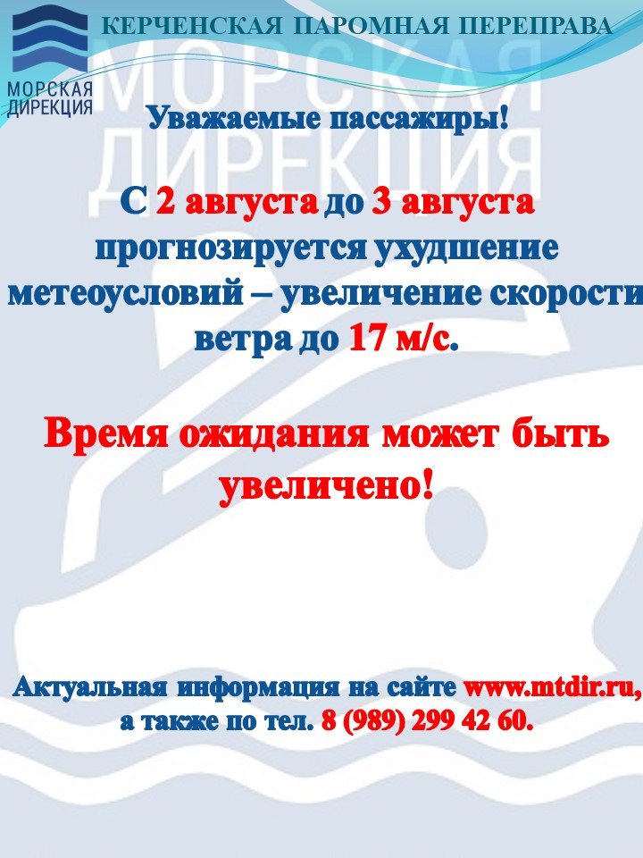На Керченской паромной переправе, сj 2 по 3 августа прогнозируется ухудшение погодных метеоусловий - увеличение скорости ветра до 17 м/с. Как пишет ООО «Морская дирекция», время ожидания может быть увеличено, - передает Керчь.ФМ.