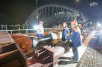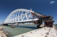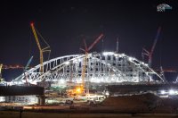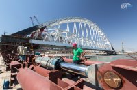 Этот сложный процесс выполняется постепенно, в дневное и ночное время, с техническими перерывами. Арка двигается к месту погрузки на плавучую систему, которая перевезет ее к фарватерным опорам моста через Керченский пролив.