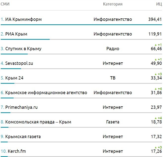 Среди лидеров рейтинга информагентства Крыминформ, РИА Крым, Спутник в Крыму, Sevastopol.su, Крым 24, Крымское информационное агентство, Primechaniya.ru, Комсомольская правда - Крым, Крымская газета и Керчь.ФМ.