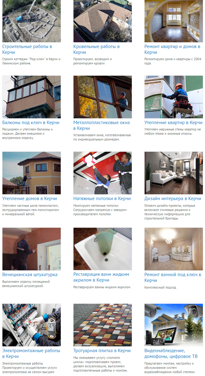 Компания «Керчьремонт» работает с 2004 года и предлагает своим клиентам широкий спектр услуг, связанных со строительством и ремонтом. Мы выполняем работы любой сложности, заключаем официальный договор, даем гарантии и четко следуем составленной смете и плану работ. Наша команда - сделает всё, чтобы ремонт оставил у вас только приятные впечатления!
