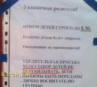 Родители керченских дошколят в одном из детских садов города увидели объявление о том, что прием детей ведется до 8.15 и связано это с антитеррористическими мероприятиями. Об этом редакции Керчь.ФМ рассказал постоянный читатель.