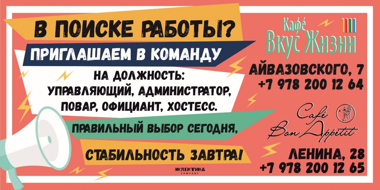 + 7 (978) 200 12 64 (кафе "Вкус Жизни") или + 7 (978) 200 12 65 (кафе "Бон Аппетит")