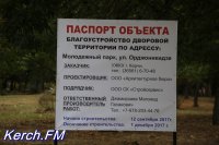 В Керчи Молодежный парк в Аршинцево продолжают реконструировать. При входе в парк для керчан повесили паспорт объекта с информацией - данными заказчика и подрядчика.