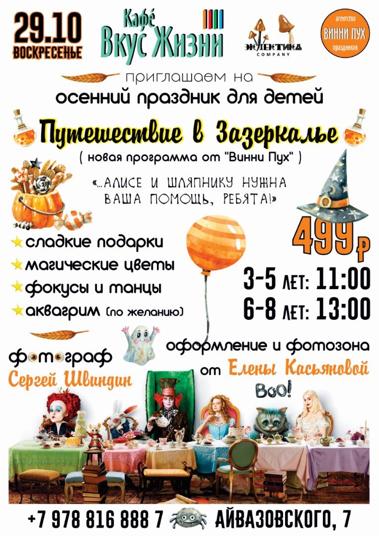 29-го октября мы приглашаем детвору на яркий и незабываемый осенний праздник "Путешествие в Зазеркалье"!