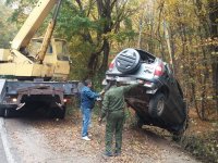 Спасатели, оградили место происшествия конусами и в целях предупреждения возгорания топлива отключили клеммы аккумулятора от бортовой сети, а также произвели смыв горюче-смазочных материалов. После чего, посредством такелажного оборудования эвакуировали автомобиль и транспортировали к дорожному полотну.