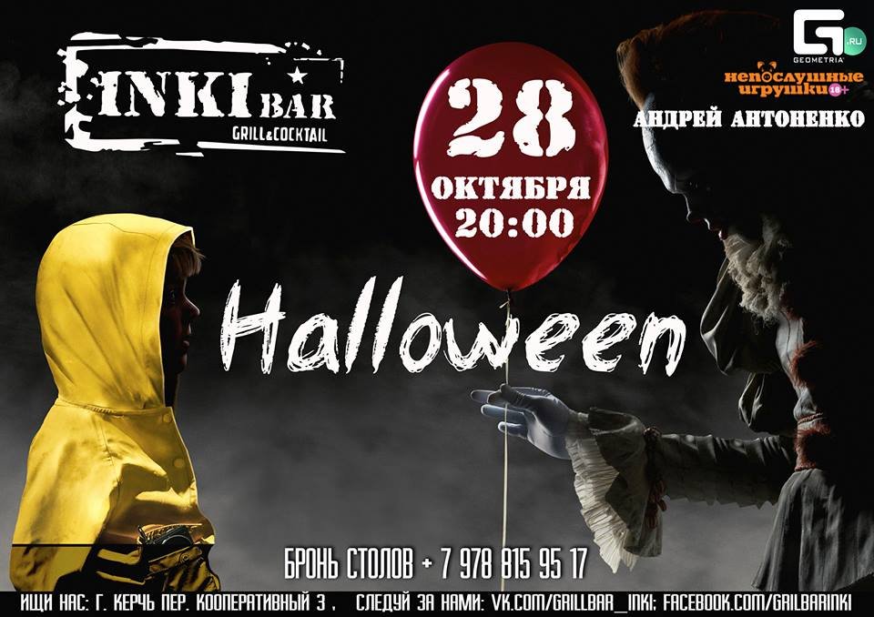 Хочешь шарик? Они летают, они все летают. Давай присоединяйся к нам, тебе здесь пoнравиться, 28 октября в гриль - бар «INKI», не забудь свой желтый дождевик.