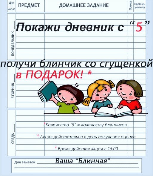 При предъявлении дневника, одна "5" = 1 блинчик!!!