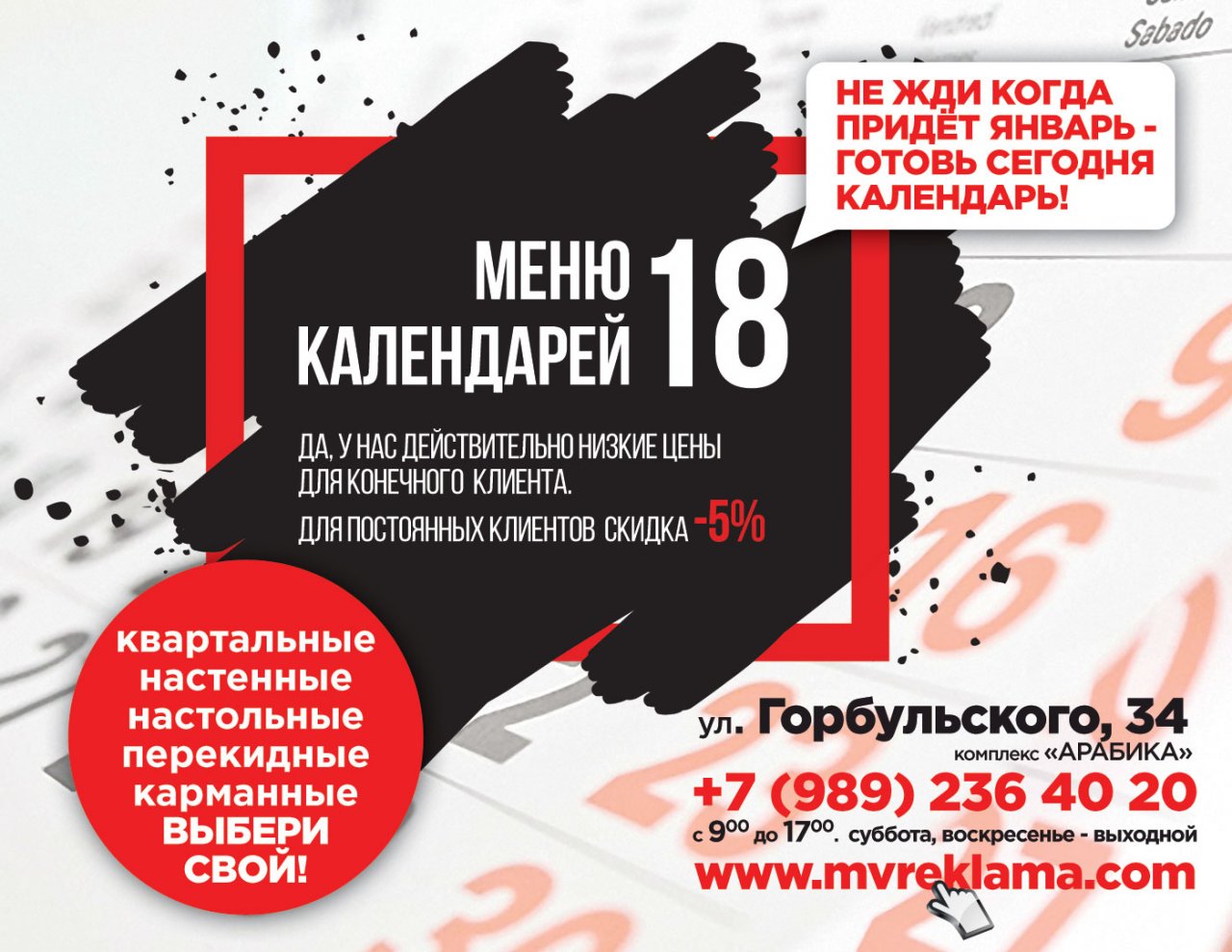 В меню на 2018 год представлены новые продукты, квартальные и настольные календари с ламинацией и УФ печатью.