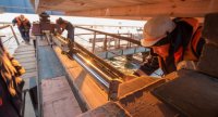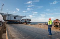 Одновременно на стройке продолжаются работы по сооружению опор и пролетов по всей трассе Крымского моста. К середине ноября сформировано более 430 опор из 595, собрано свыше 115 тысяч тонн металлоконструкций пролетных строений из более 260 тысяч тонн. На морских участках между островом Тузла и керченским берегом продолжается сооружение пролетов методом продольной надвижки. На готовых пролетах уложен нижний слой асфальта: более 7 км по направлению к Керчи и 2, 5 км по направлению к Тамани. Верхний слой асфальта: почти 2 км по направлению к Керчи и около 1, 5 км - к Тамани.