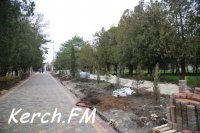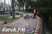 Рабочие укладывают плитку и ремонтируют арку. В парке высадили деревья.
