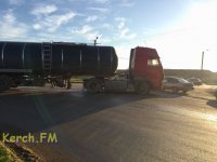 Фура-цистерна бензовоз "Вольво" на повороте «притерла» "Ладу Ларгус". Движение на данном участке затруднено.