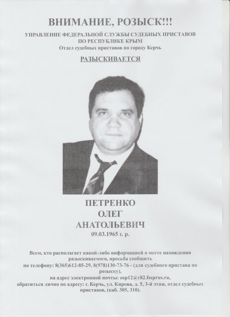 В Керчи судебные приставы разыскивают 52-летнего Олега Петренко. Как пишет пресс-служба, он находится в розыске за уклонение о выполнении решения суда по кредитным обязательствам, - передает Керчь.ФМ
