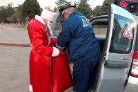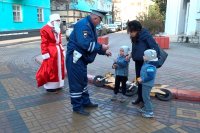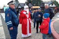 Сотрудник отдела ГИБДД УМВД России по г.Керчи Алексей Крихели интересовался у ребят знаниями правил безопасного поведения на дороге. За правильные ответы полицейский вручал девчонкам и мальчишкам световозвращаюшие элементы, которые ребята должны использовать в темное время суток, а Полицейский Дед Мороз раздавал сладости и мандарины.