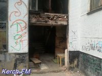 Возле самого здания, которое разбито, у которого частично рушится отделка внутри и снаружи и выбиты окна, мы увидели дымок и услышали голоса. Хотя журналисты сайта Керчь.ФМ не из робких, но мы все же не стали заходить в эту часть здания, чтобы "не испортить незваными гостями" новогодние праздники людям. Также, практически в каждой комнате видны следы огня на стенах и потолке.
