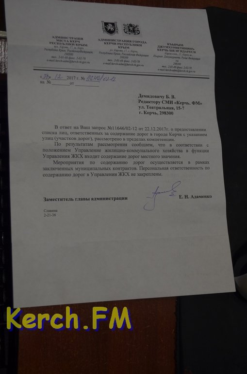 Дорога по улице Бувина входит в перечень дорог местного значения. По информации Администрации города Керчи, содержание дорог местного значения входит в перечень ответственности УЖКХ города.