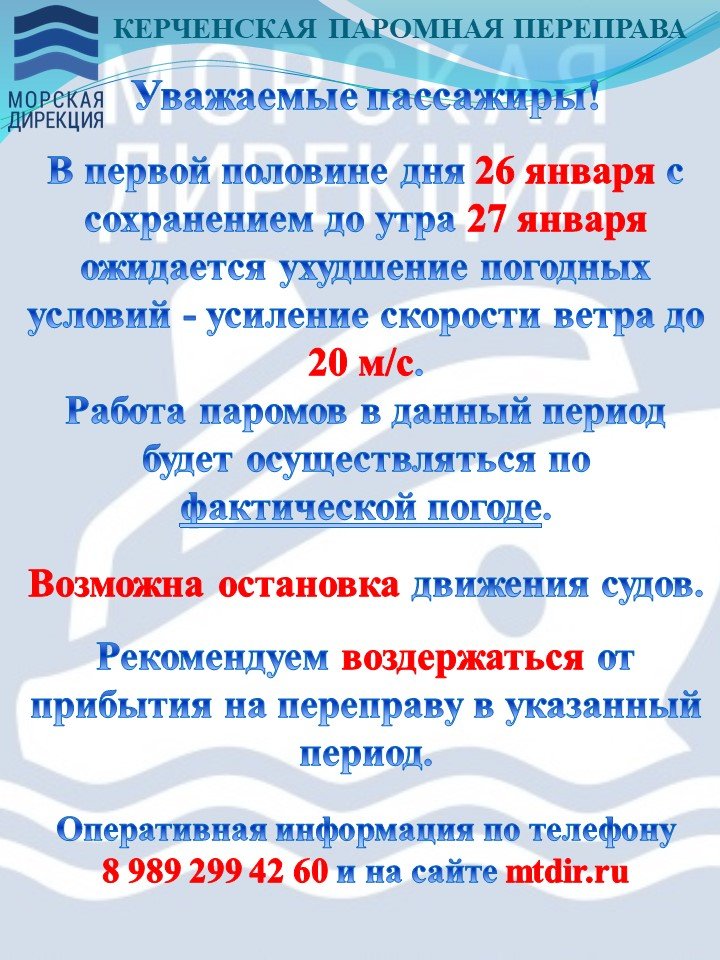 Пассажирам рекомендуем воздержаться от прибытия на переправу с учетом данного прогноза, а также знакомиться с оперативной информацией о работе переправы на сайте оператора паромной переправы по адресу www.mtdir.ru и в call-центре по номеру телефона 8 (989) 299 42 60.