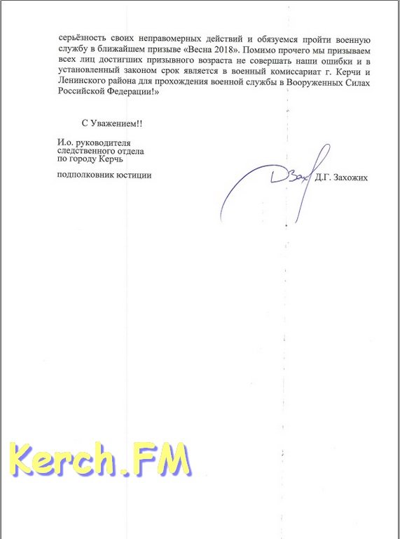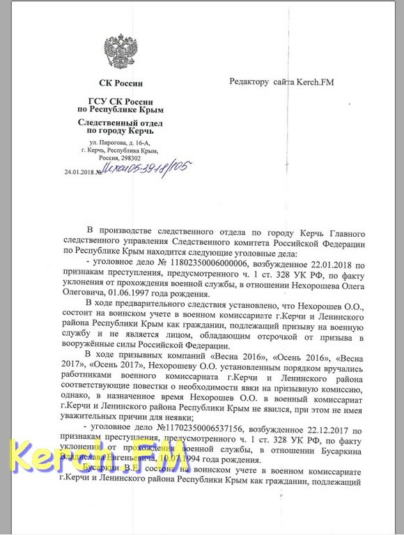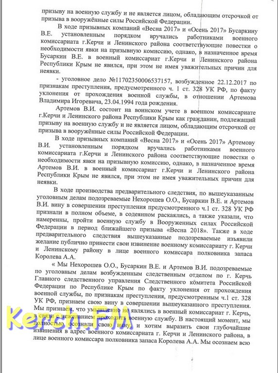 «Мы, Нехорошев О.О., Бусаркин В.Е. и Артемов В.И., подозреваемые по уголовным делам возбужденным следственным отделом по г. Керчь Главного следственного управления Следственного комитета Российской Федерации по Республике Крым по факту уклонения от прохождения военной службы, по признакам преступления, предусмотренным ч.1 ст. 328 УК РФ, признаем свою вину в совершении вышеуказанного преступления. Мы признаем, что умышленно не являлись в военный комиссариат г. Керчь, в связи с нежеланием проходить военную службу. В настоящий момент, мы полностью осознали свою вину, и хотим выразить свои глубочайшие извинения в адрес военного комиссариата г. Керчи и Ленинского района, в лице военного комиссара полковника запаса Королева А.А. Мы осознаем всю серьёзность своих неправомерных действий и обязуемся пройти военную службу в ближайшем призыве «Весна 2018». Помимо прочего мы призываем всех лиц достигших призывного возраста не совершать наши ошибки и в установленный законом срок является в военный комиссариат г. Керчи и Ленинского района для прохождения военной службы в Вооруженных Силах Российской Федерации!»