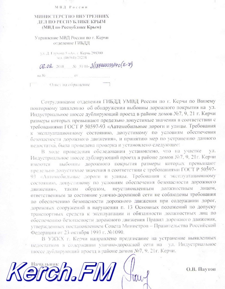 Что касается дороги в районе домов по ул. Индустриальное шоссе, 7,9, 21, керчанин даже отправлял заявление в ГИБДД о выбоинах, которые нарушают все требования. В ГИБДД ответили, что в УЖКХ Керчи направили предписание на устранение этих выбоин. Такой ответ керчанин получил еще 6 февраля, но УЖКХ игнорируют предписание даже от ГИБДД.