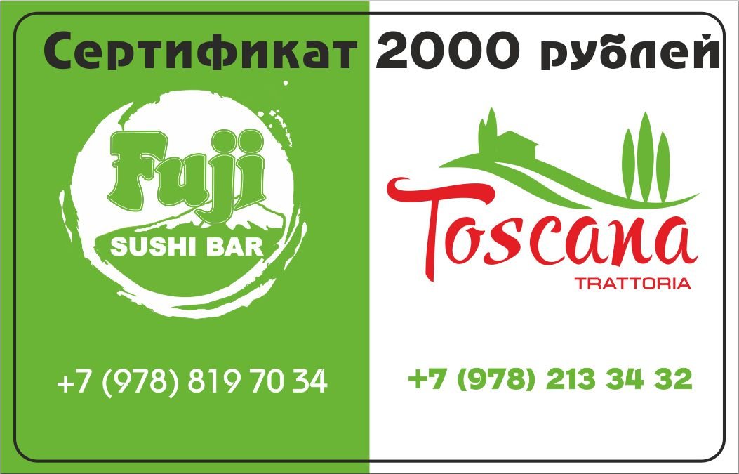 Подарочный сертификат на 2000 рублей от ресторана итальянской кухни «Тоскана» и суши-бара «Фуджи»