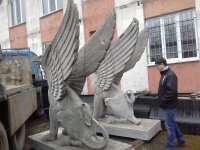 «Состояние сохранности скульптур грифонов определено как аварийное. На протяжении 30 лет скульптуры подвергались негативному воздействию природных и антропогенных факторов. В частности, были отбиты и утрачены хвосты грифонов, обколоты верхние грани крыльев. Обнажившаяся металлическая арматура корродировала и увеличилась в объеме, угрожая разрушением бетона», — уточняет пресс-служба