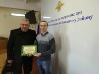 За активное участие в конкурсе Дмитрия поблагодарил председатель Общественного Совета при ОМВД России по Ленинскому району Андрей Бабич. За активную гражданскую позицию и пропаганду здорового образа жизни он вручил победителю почетную грамоту.
