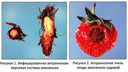 Антракноз земляники (Colletotrichum acutatum Simmonds ) — поражает листья, побеги, корневую систему и ягоду земляники садовой. Возбудителями заболевания могут быть несколько видов грибов рода Colletotrichum: Colletotrichum acutatum, Colletotrichum fragariae и Colletotrichum gloesporoides. Наиболее вредоносными являются две формы заболевания — корневая гниль и гниль ягод (плодов). В большинстве случаев, антракноз распространен в теплых южных районах выращивания земляники, вспышки заболевания могут привести к 100% потере плодов. Гриб может поражать ягоды, побеги (усы), черенки и корневую систему растения. На черешках и стеблях побегов образуются темные продолговатые язвы. Иногда, пораженные болезнью черешки и стебли почти полностью покрываются язвами, в результате чего отдельные листья или растение в целом, могут начать увядать и погибнуть.