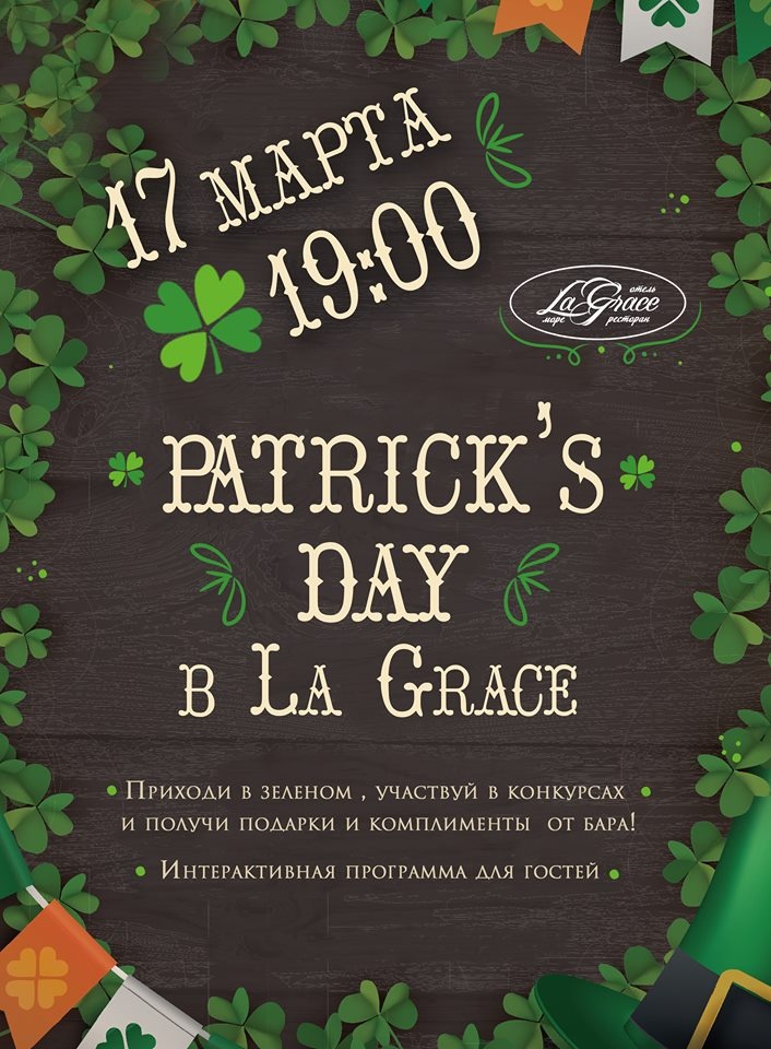 17 марта маленькая Ирландия в La Grace! Приходи с друзьями, участвуй в конкурсах, получай подарки и комплименты от бара! В день Патрика у нас будет душевно и атмосферно, интерактивная программа с каждым гостем, остроумные шутки и весёлые соревнования! Проведи выходные с нами)