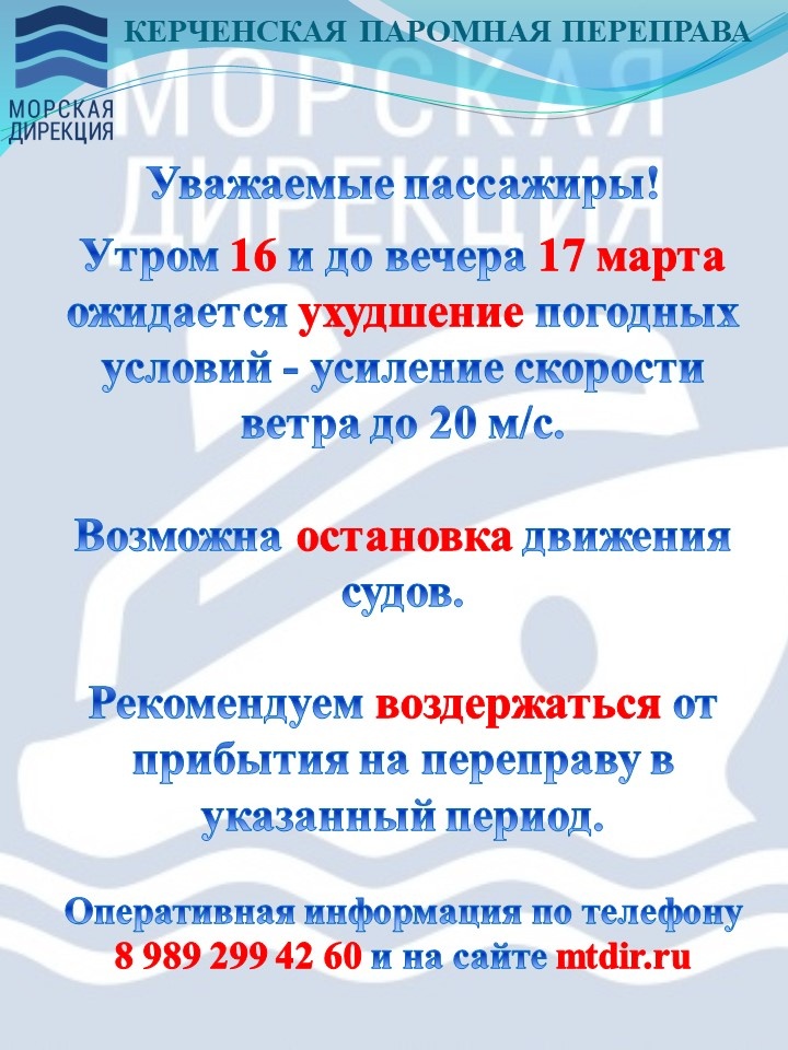 На Керченской паромной переправе утром 16 и до вечера 17 марта ожидается ухудшение метеоусловий - увеличение скорости ветра до 17-20 м/с. Об этом сообщает ООО «Морская дирекция», - передает Керчь.ФМ