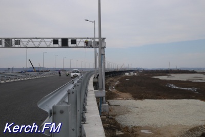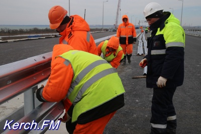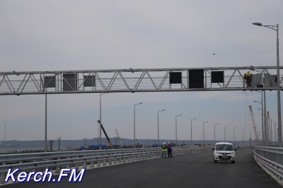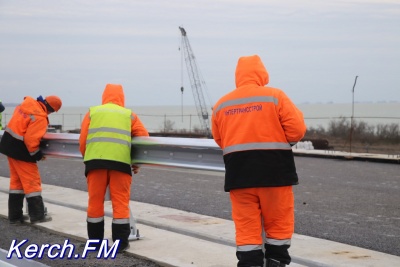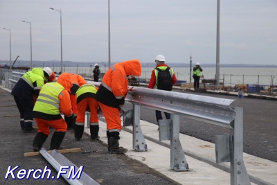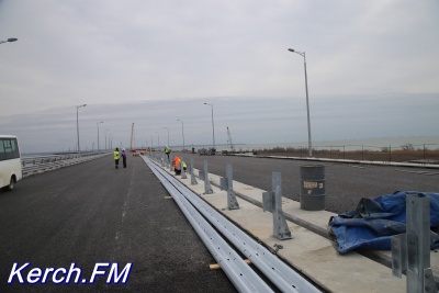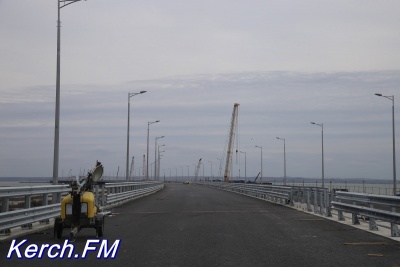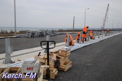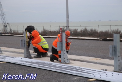 Автодорожная часть Крымского моста уже построена - забиты все сваи, готовы пролеты. Остались работы по устройству дорожного полотна, большая часть уже заасфальтирована в два слоя. На участках с асфальтом устанавливают барьерное ограждение, мачтовое освещение и информационные табло, оборудуют ливневки.